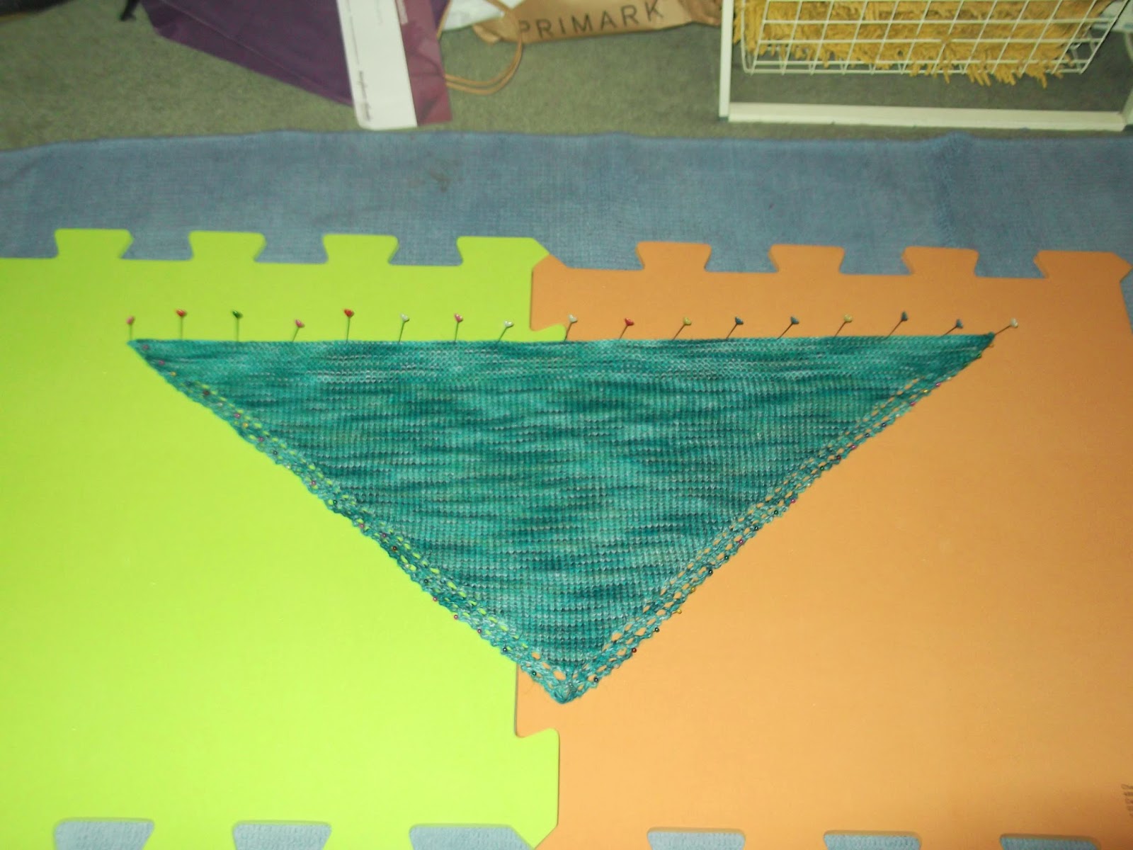 I finished Breeze and washed it, so this is a photo of it blocking on my bedroom floor. I will be wrapping it up tonight and hope to be able to show you a picture of it being worn at some point. So that's two goals down for last week.